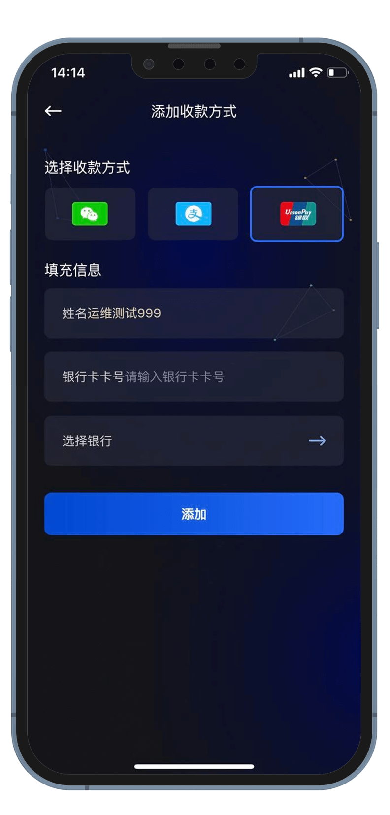 绑定银行卡,输入对应卡号,选择银行 点击添加,即可完成绑定