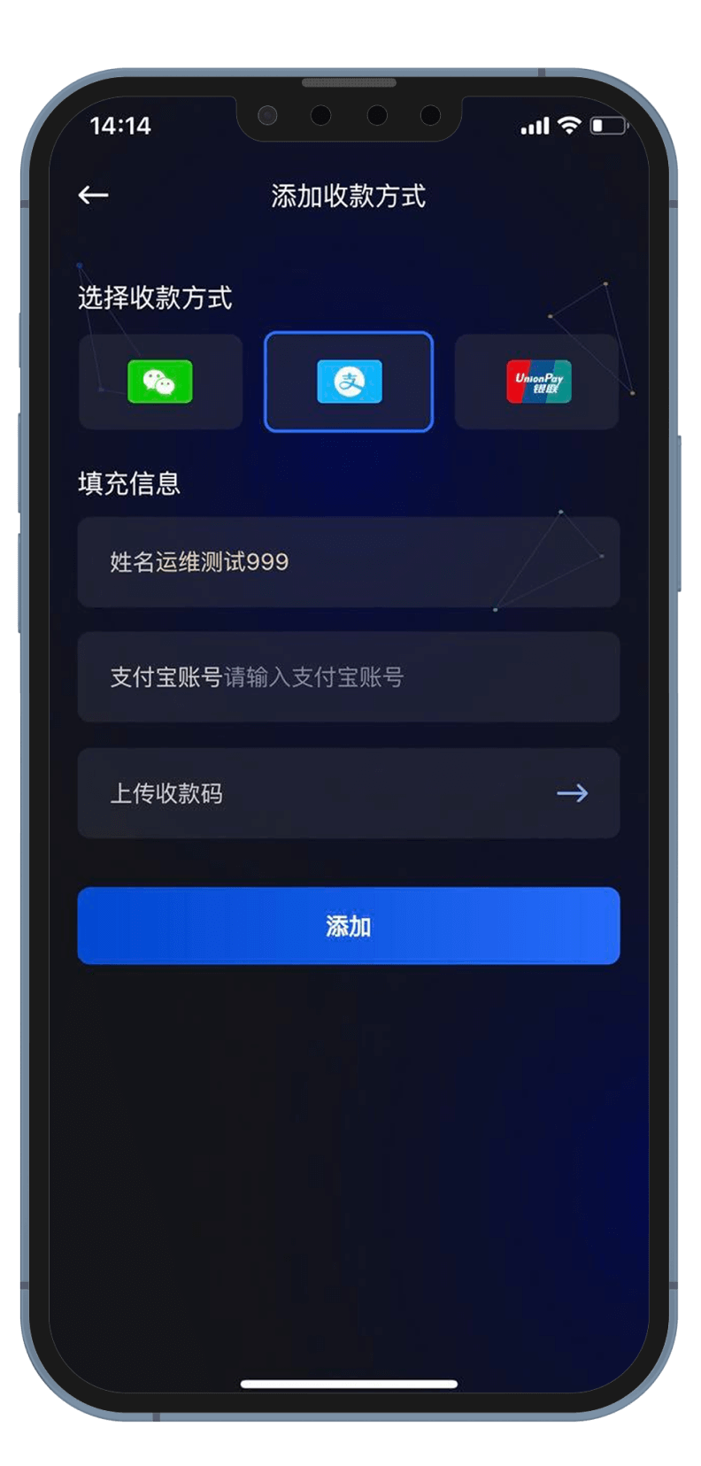 绑定支付宝收款方式,输入对应支付宝账号,上传收款码,点击添加,即可完成绑定