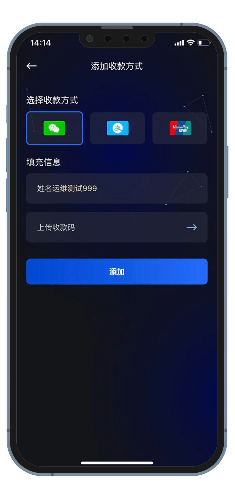 选择微信收款方式, 点击上传收款码,上传需要收款的二维码, 点击添加,即可完成绑定