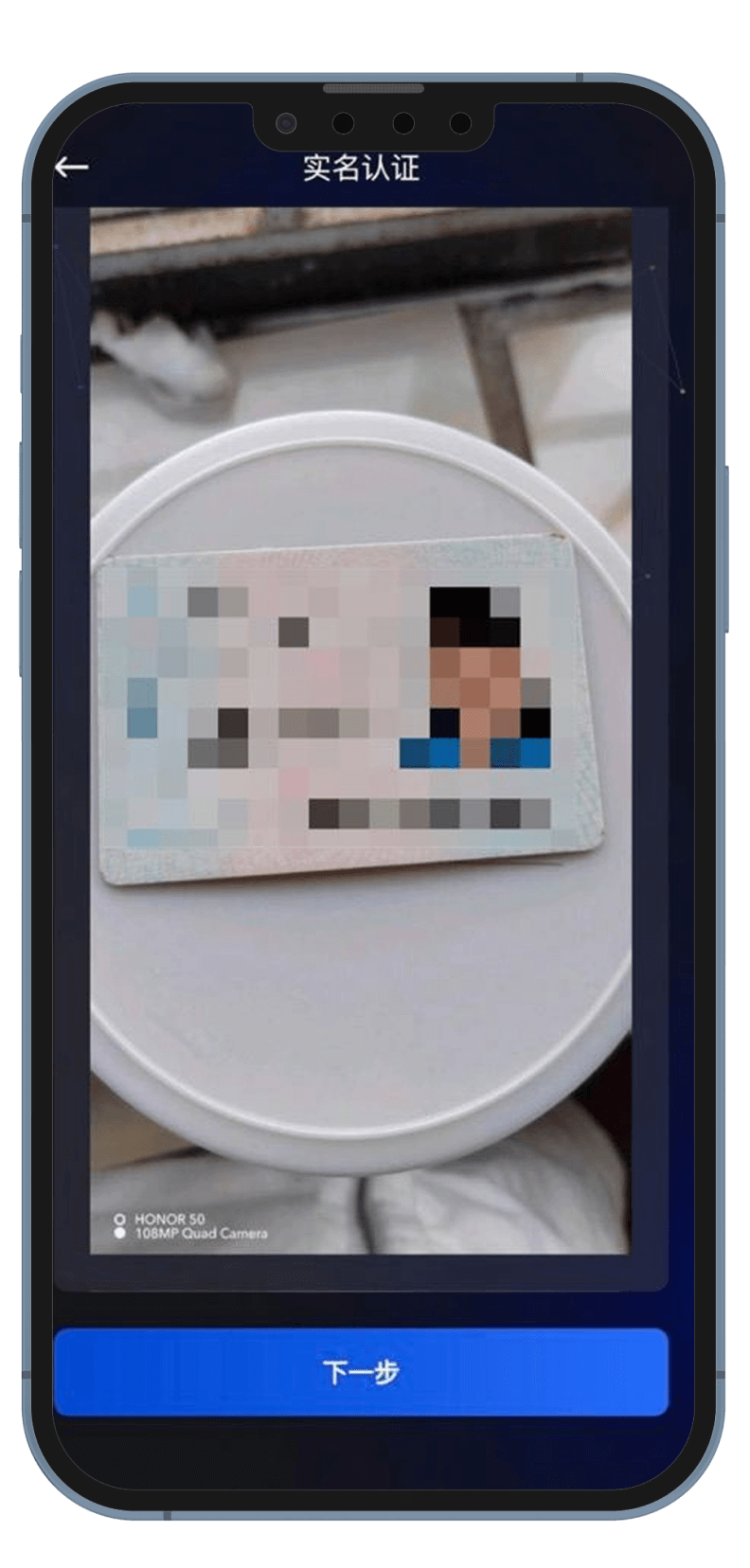 输入对应实名,身份证号,上传身份证正面,点击下一步进行操作
