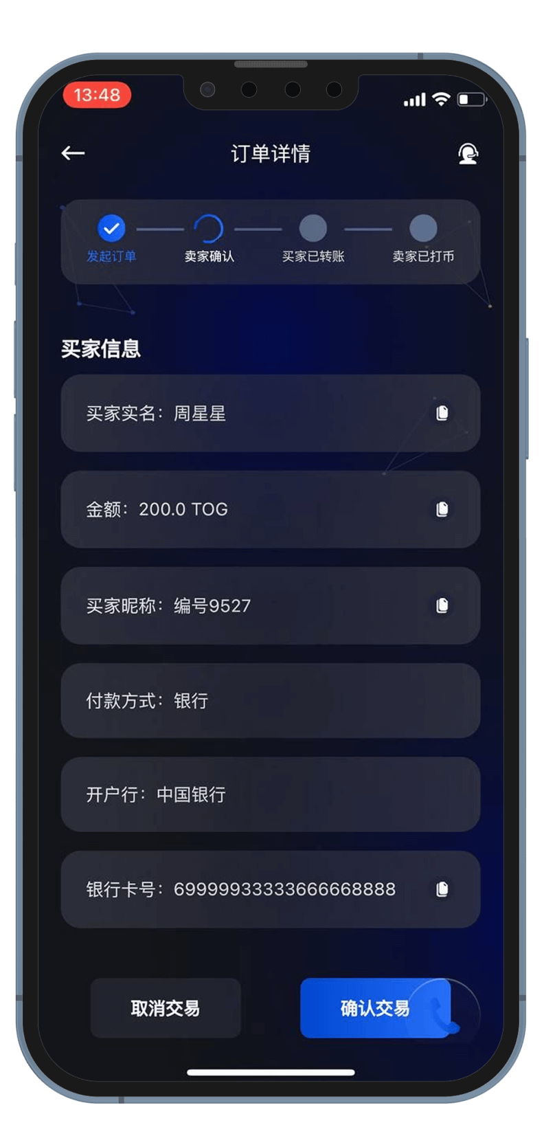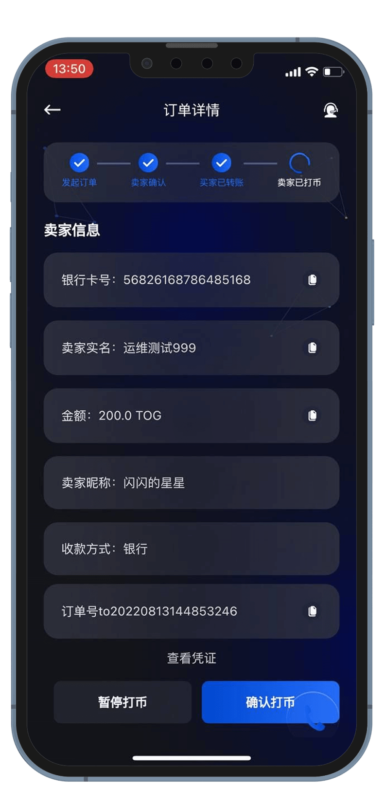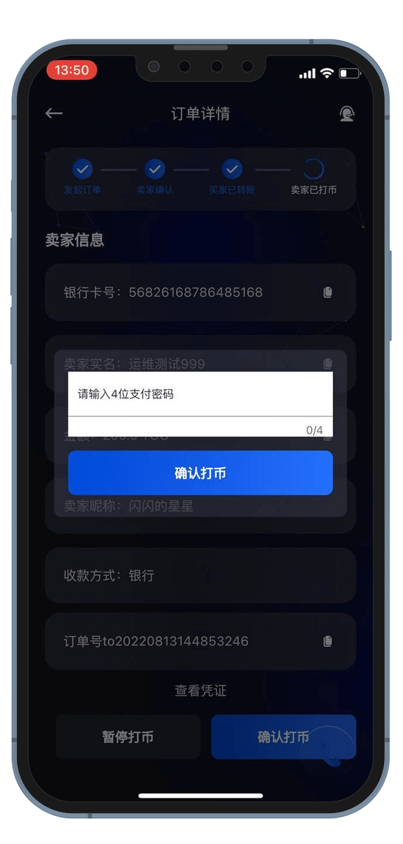 确认收到钱后输入4位支付密码,并点击确认打币,即可完成交易 温馨提示:忘记密码? 请暂停订单,并点击右上角,联系TOpay 24小时在线客服帮您解决。