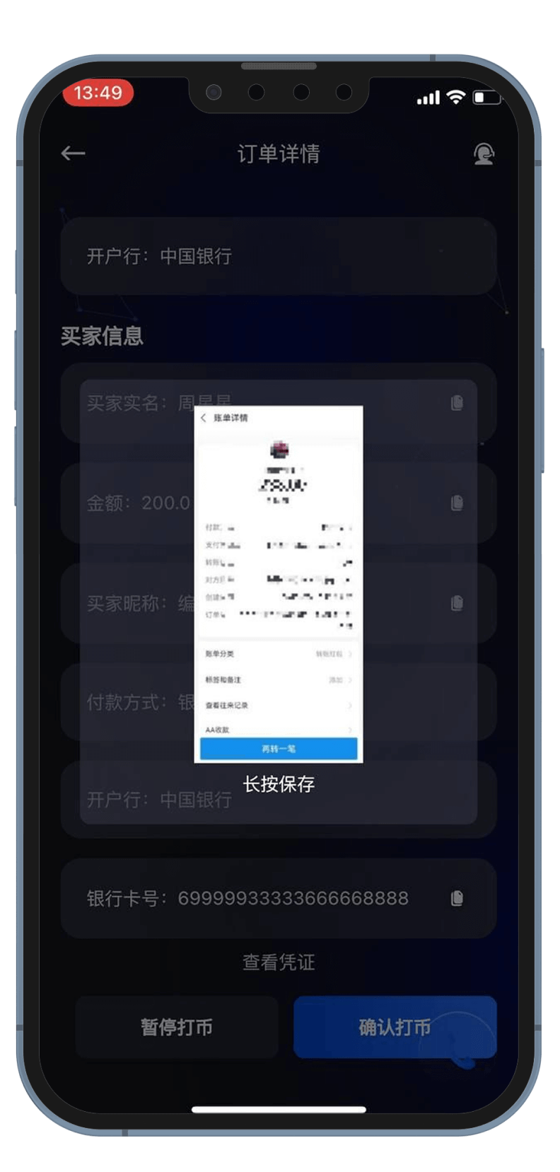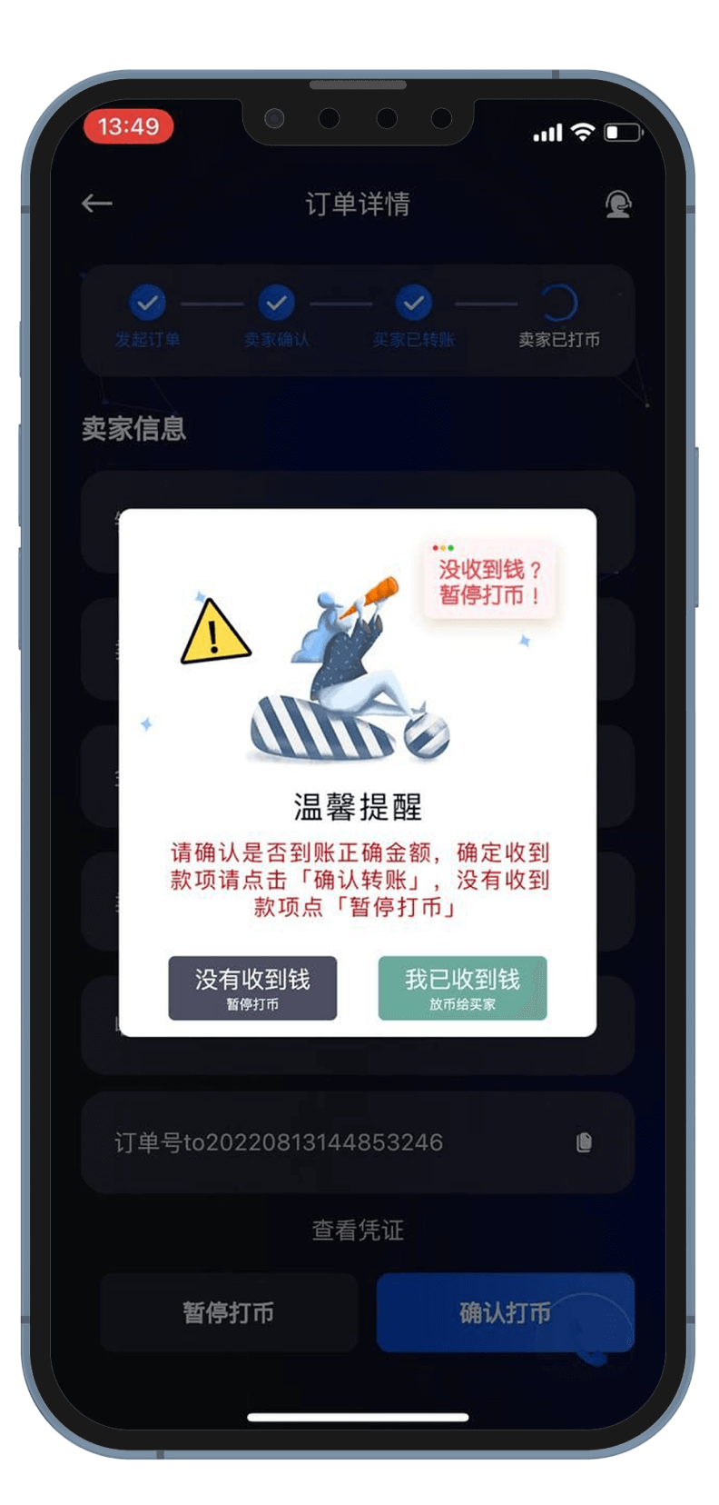 收到款后确认打币,请确认已收到款项,如收到后点击我已收到钱,未收到对应金额请立即点击暂停订单并联系在线客服